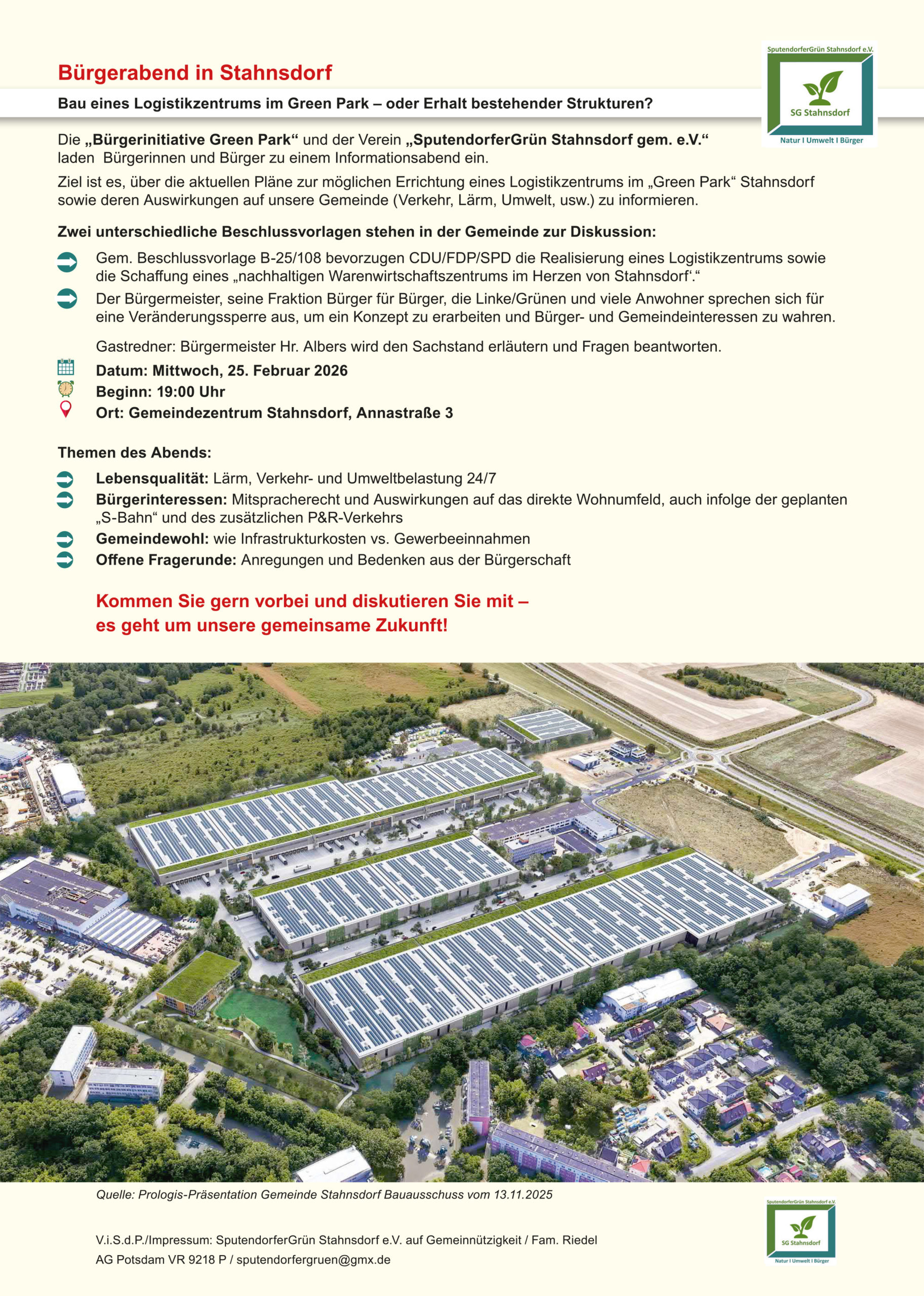 Die Zukunft des „Green Park“ steht zur Debatte. Alle Bürgerinnen und Bürger von Stahnsdorf sind herzlich eingeladen, sich über die aktuellen Pläne zur Errichtung eines großen Logistikzentrums und deren Auswirkungen auf die Gemeinde zu informieren.