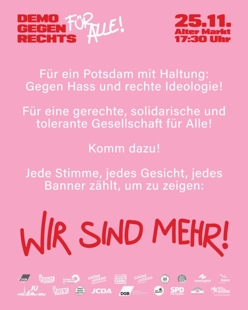 Ein Bündnis aus vielen antifaschistischen Akteur:innen und Jugendorganisationen aus der Region ruft alle Demokrat:innen dazu auf, sich am 25. November dem Demozug anzuschließen und zusammen auf die Straße zu gehen!